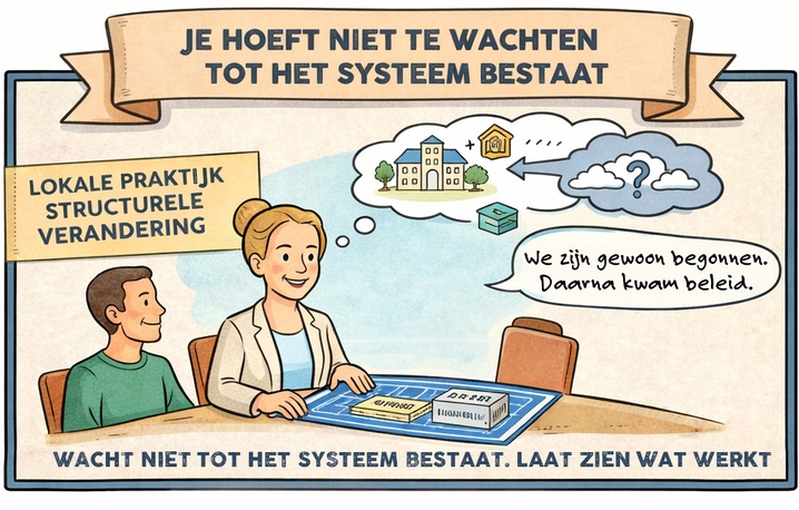 “Ruimte en vertrouwen. Wij hebben het geluk dat ons bestuur en onze directie ruimte gaven om dit op te bouwen. Maar zelfs als die ruimte er nog niet volledig is, moet je beginnen. Wacht niet tot het systeem bestaat. Vorm het zelf, al is het klein. We zijn ooit met concrete casussen naar de gemeente gegaan. We lieten zien: zo deden we het vroeger, zo doen we het nu, dit is het verschil. Dat helpt beleidsmakers om te begrijpen wat het in de praktijk betekent.