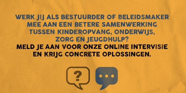 Werk jij als bestuurder of beleidsmaker/-adviseur in jouw regio aan de samenwerking tussen kinderopvang, onderwijs, zorg en jeugdhulp? En kom je specifieke uitdagingen tegen in de samenwerking waarover je in een kleine setting wil uitwisselen met collega beleidsmakers/-adviseurs en bestuurders? Meld je dan aan voor deze online intervisiebijeenkomst!